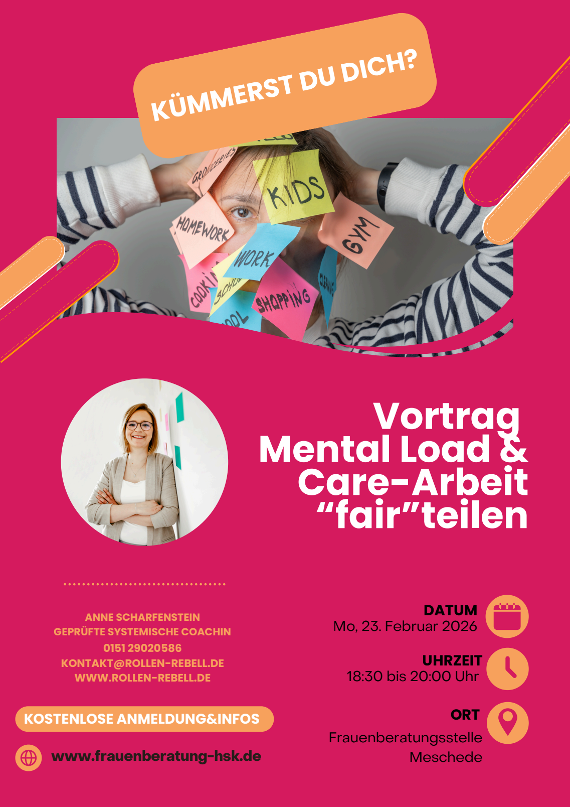 In diesem Vortrag möchten wir gemeinsam darauf schauen, was Mental Load und Care-Arbeit eigentlich bedeuten, warum sie im Alltag oft an bestimmten Personen hängen bleiben und weshalb es so wichtig ist, Verantwortung gerechter zu teilen. Anne Scharfenstein, systemische Coachin, gibt praxisnahe Impulse für eine alltagstaugliche, faire Verteilung und zeigt, wie wir kleine, aber wirksame Veränderungen im Alltag umsetzen können.